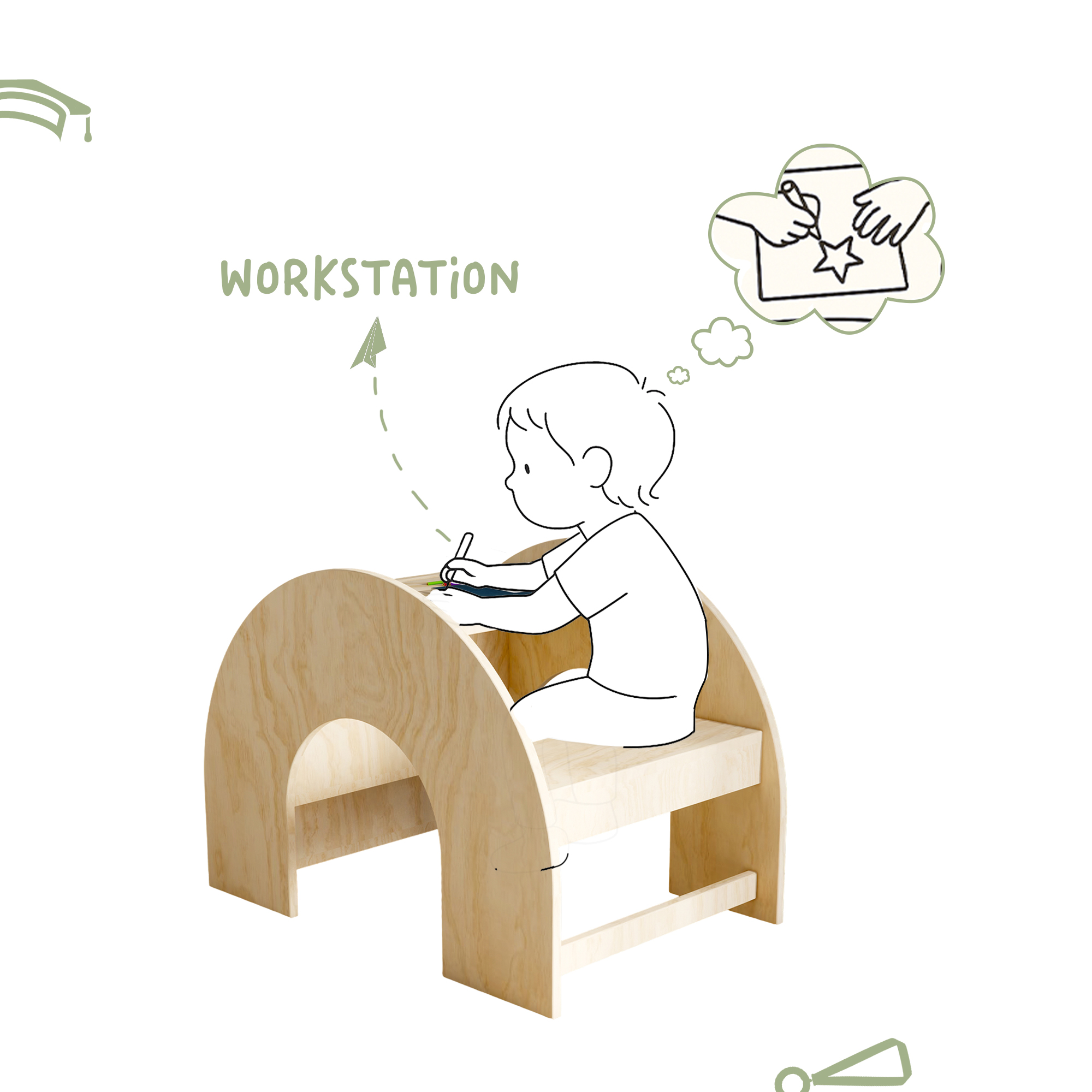 - Becomes a workstations at same time, providing larger table top surface for reading, sketching