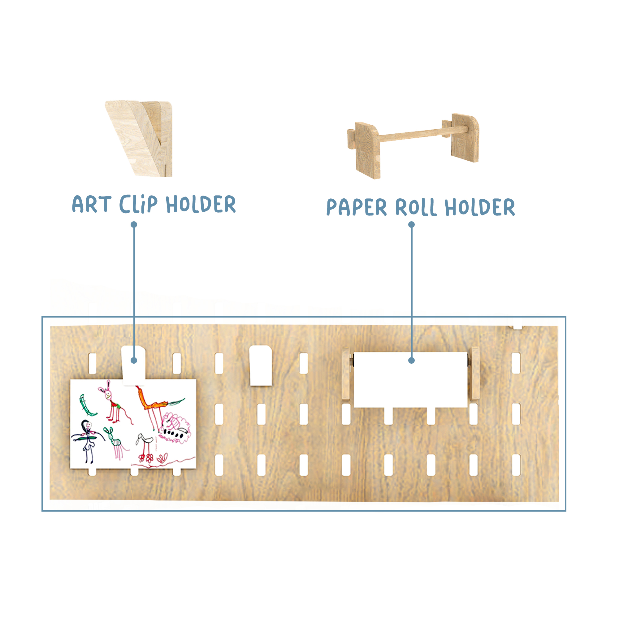 • Adjustable pegs and hooks to accommodate tools, supplies, or artwork