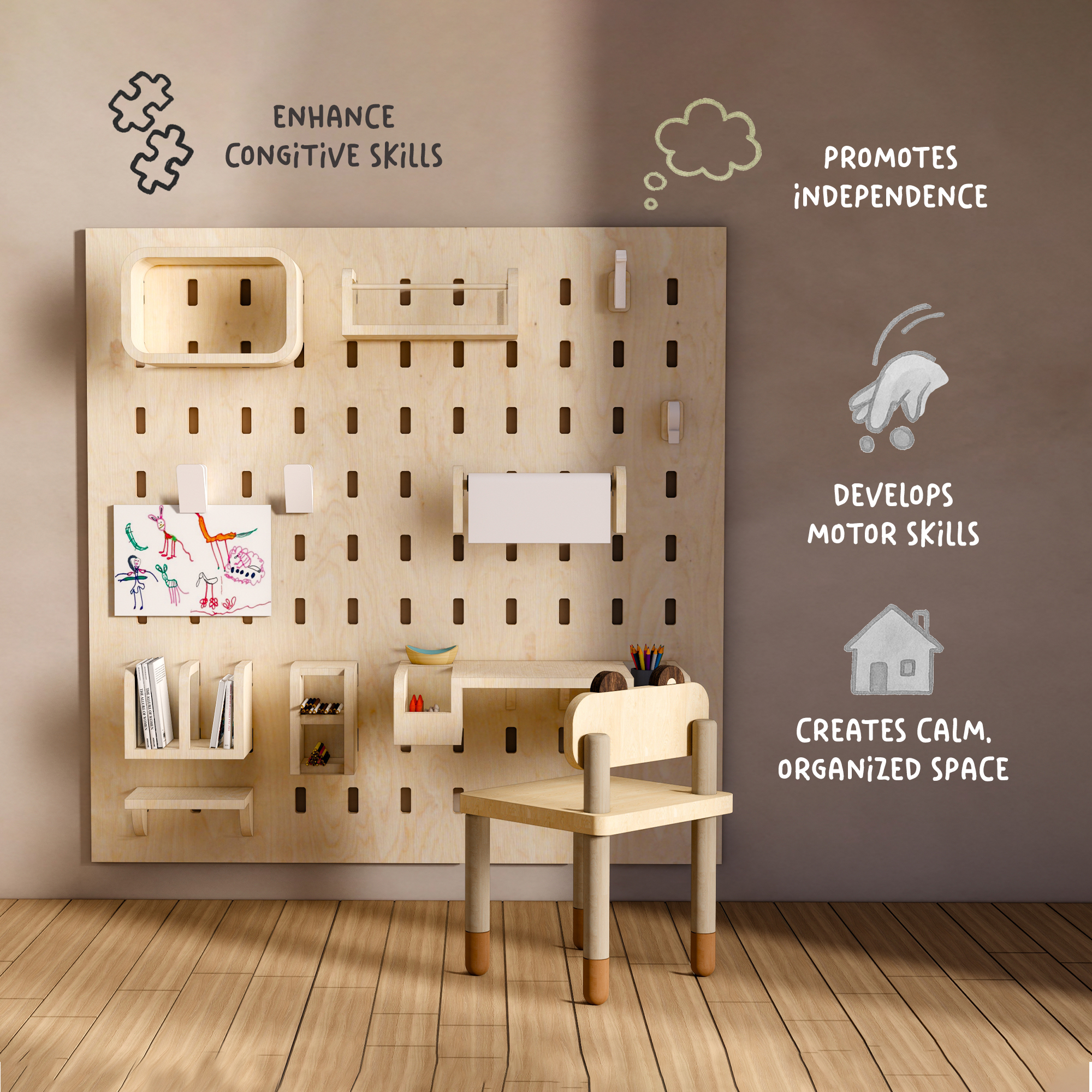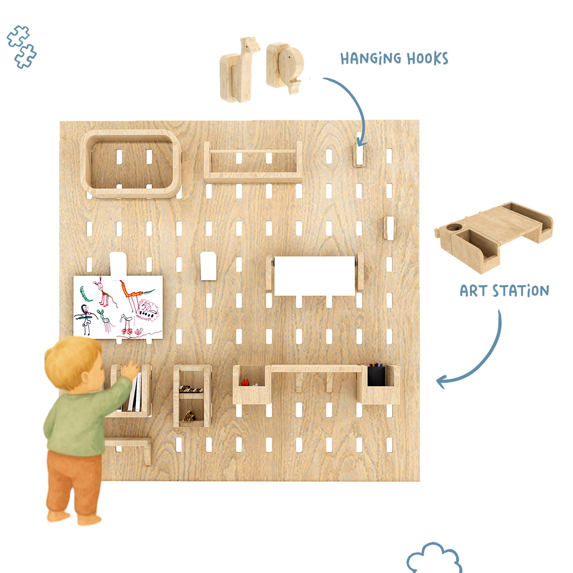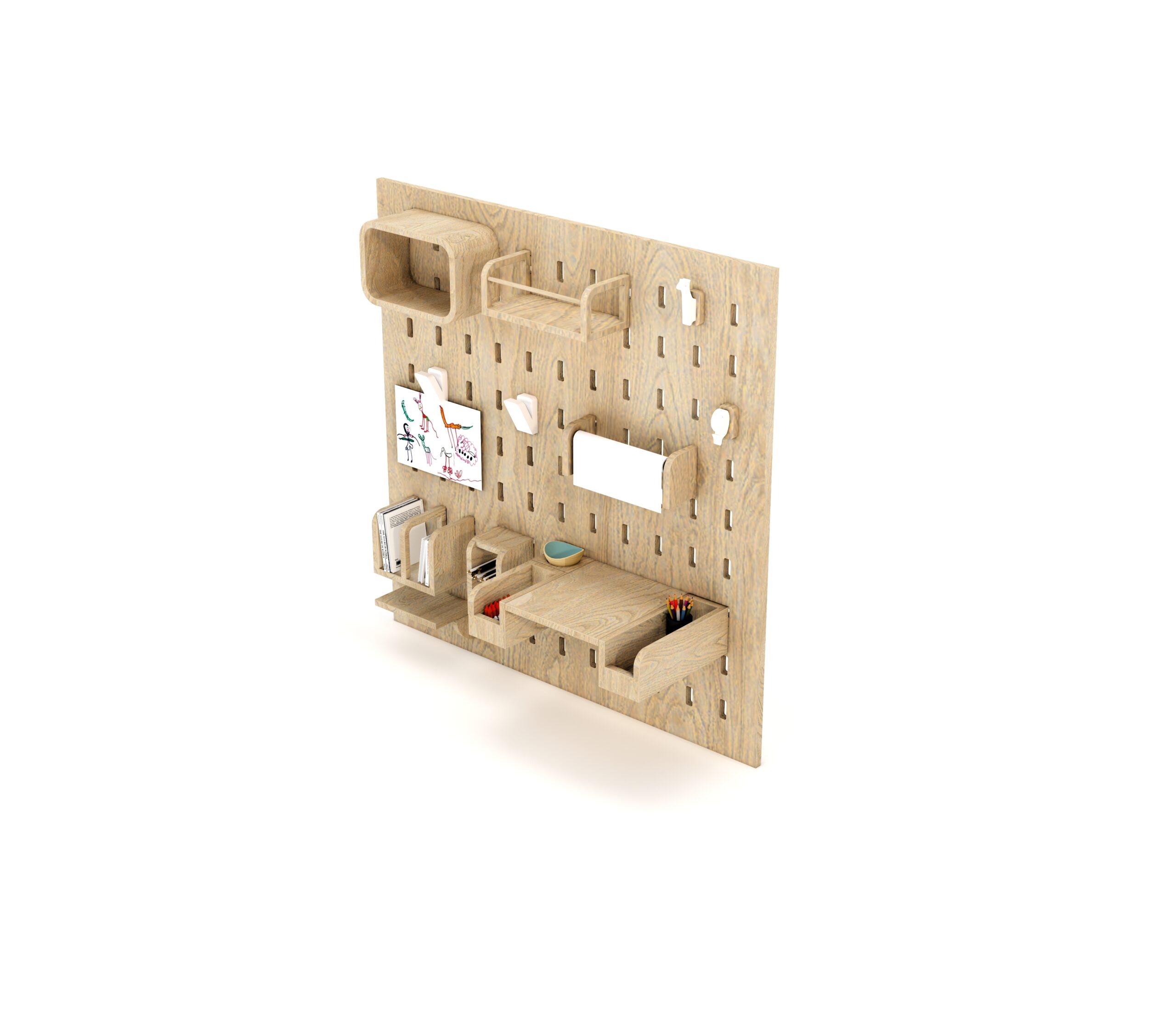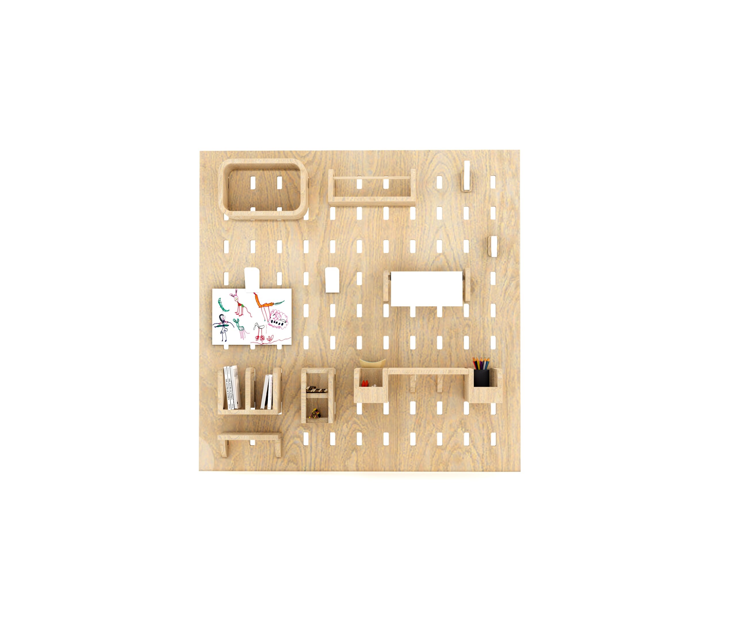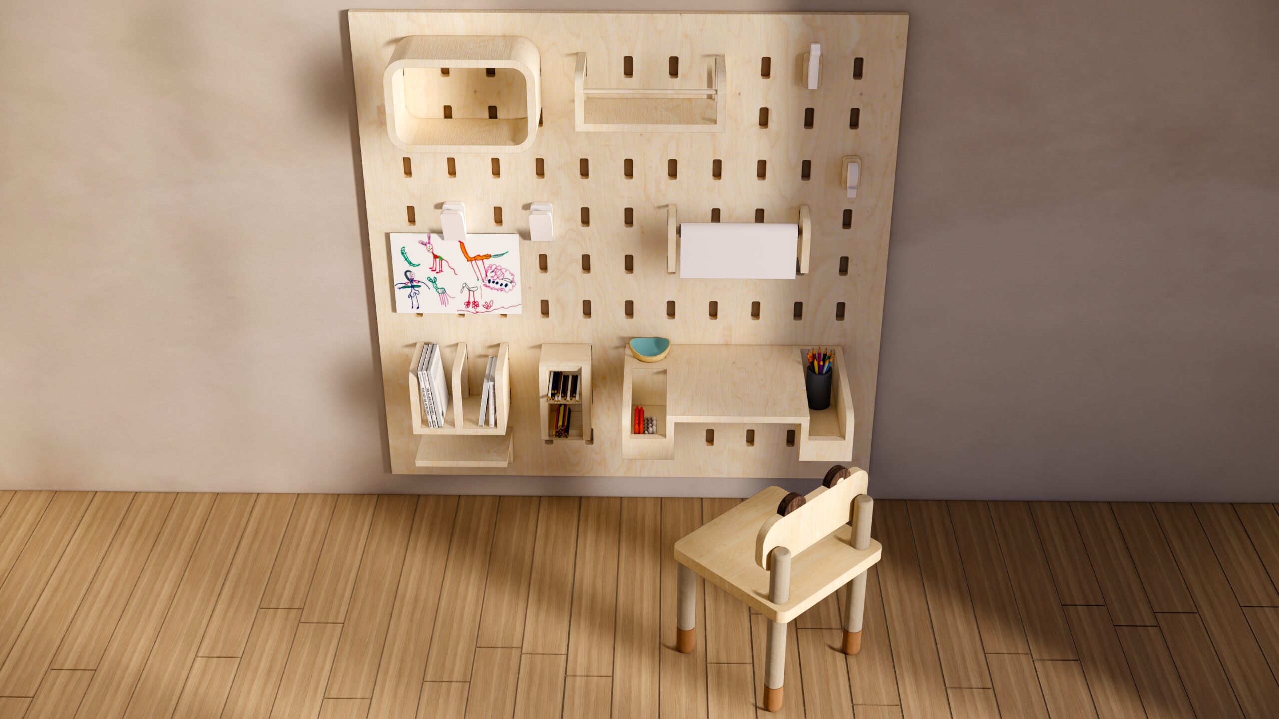 A pegboard organiser in a kid?s room or play area isn?t just a trendy decor item ? it?s super practical and developmentally beneficial too