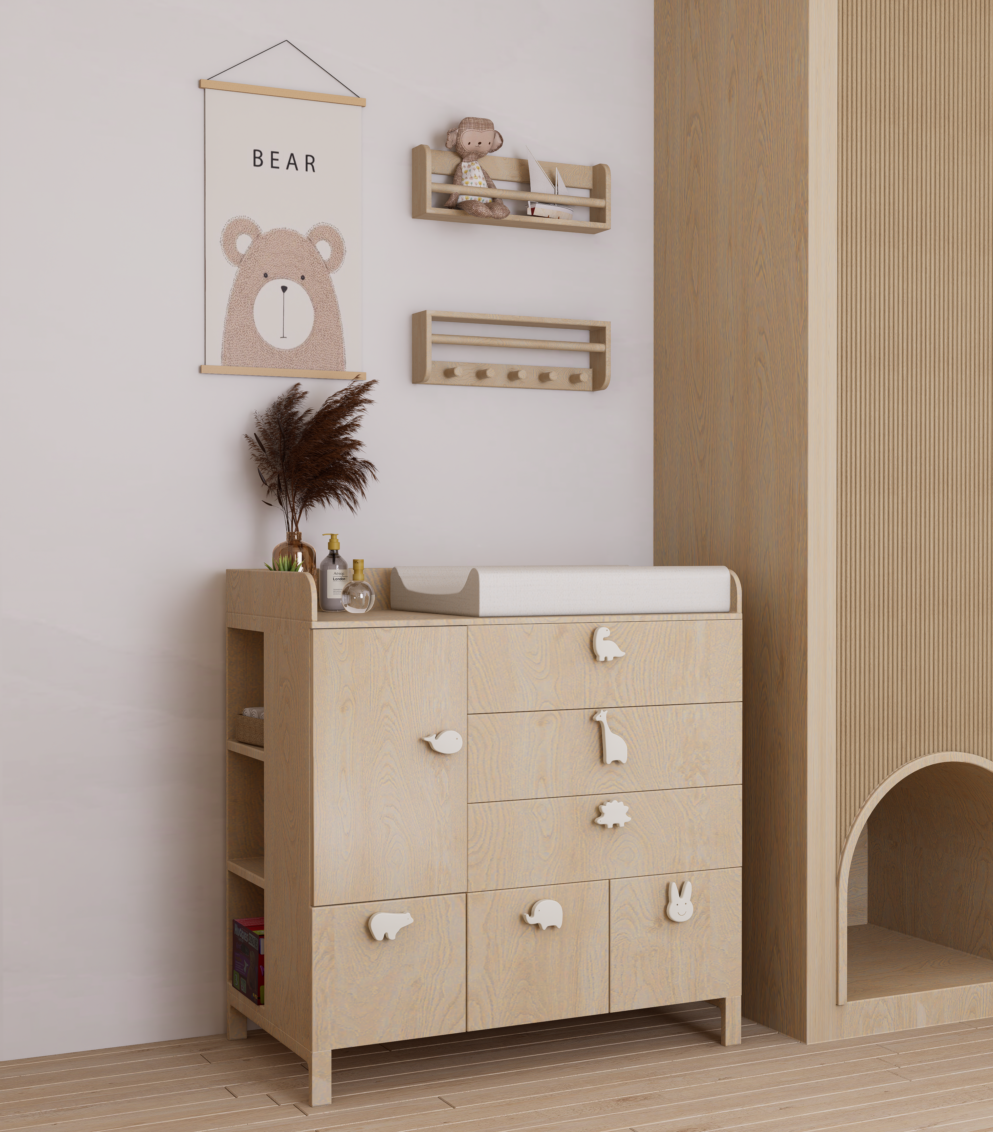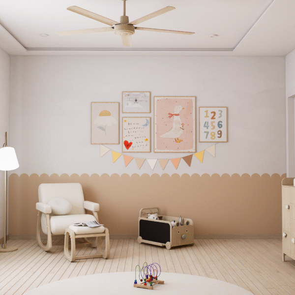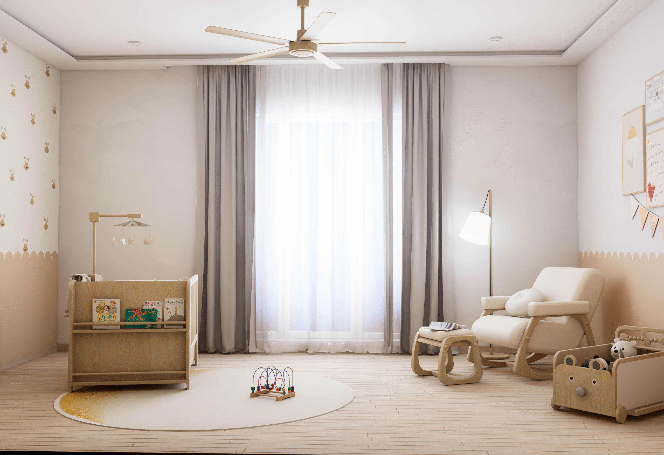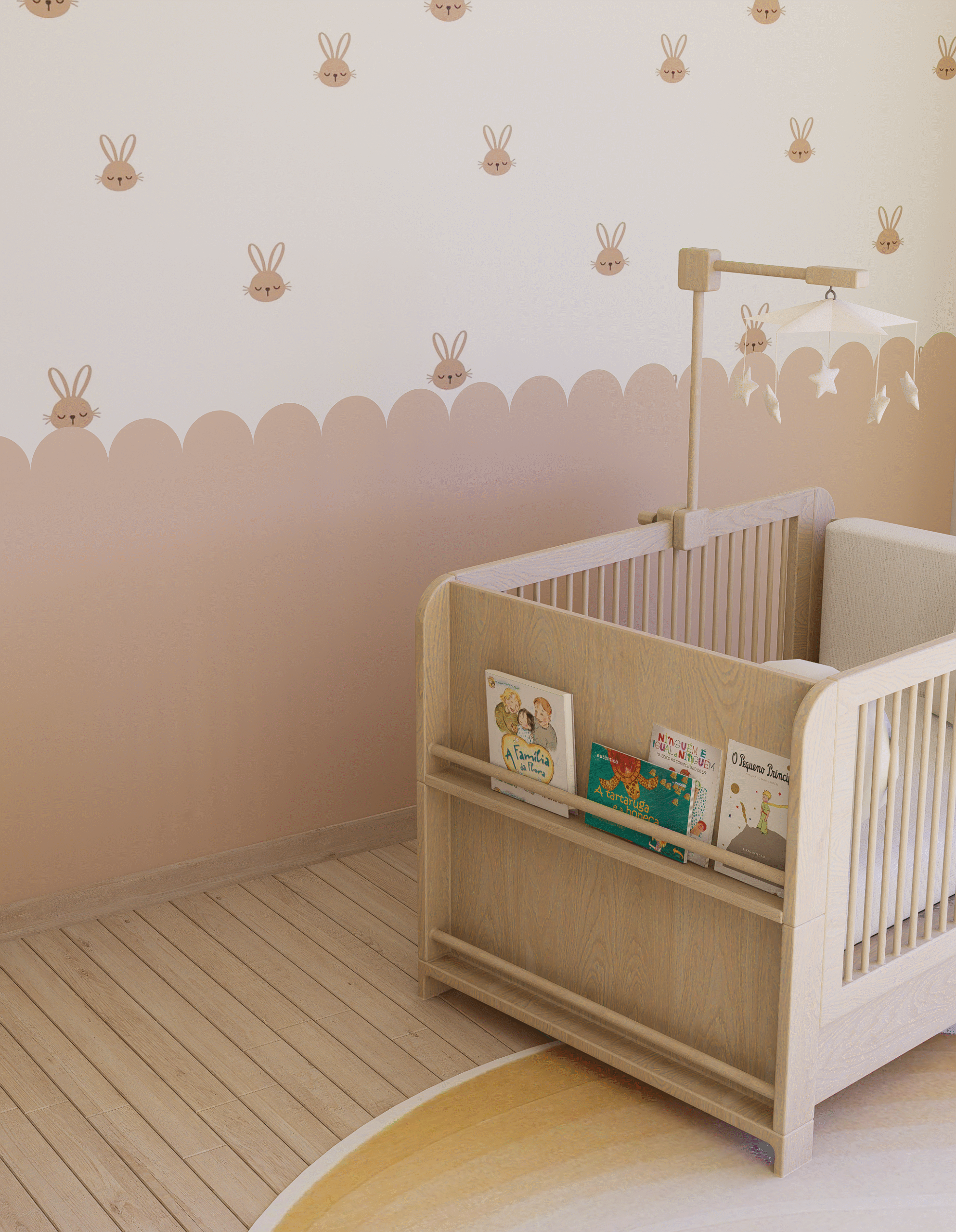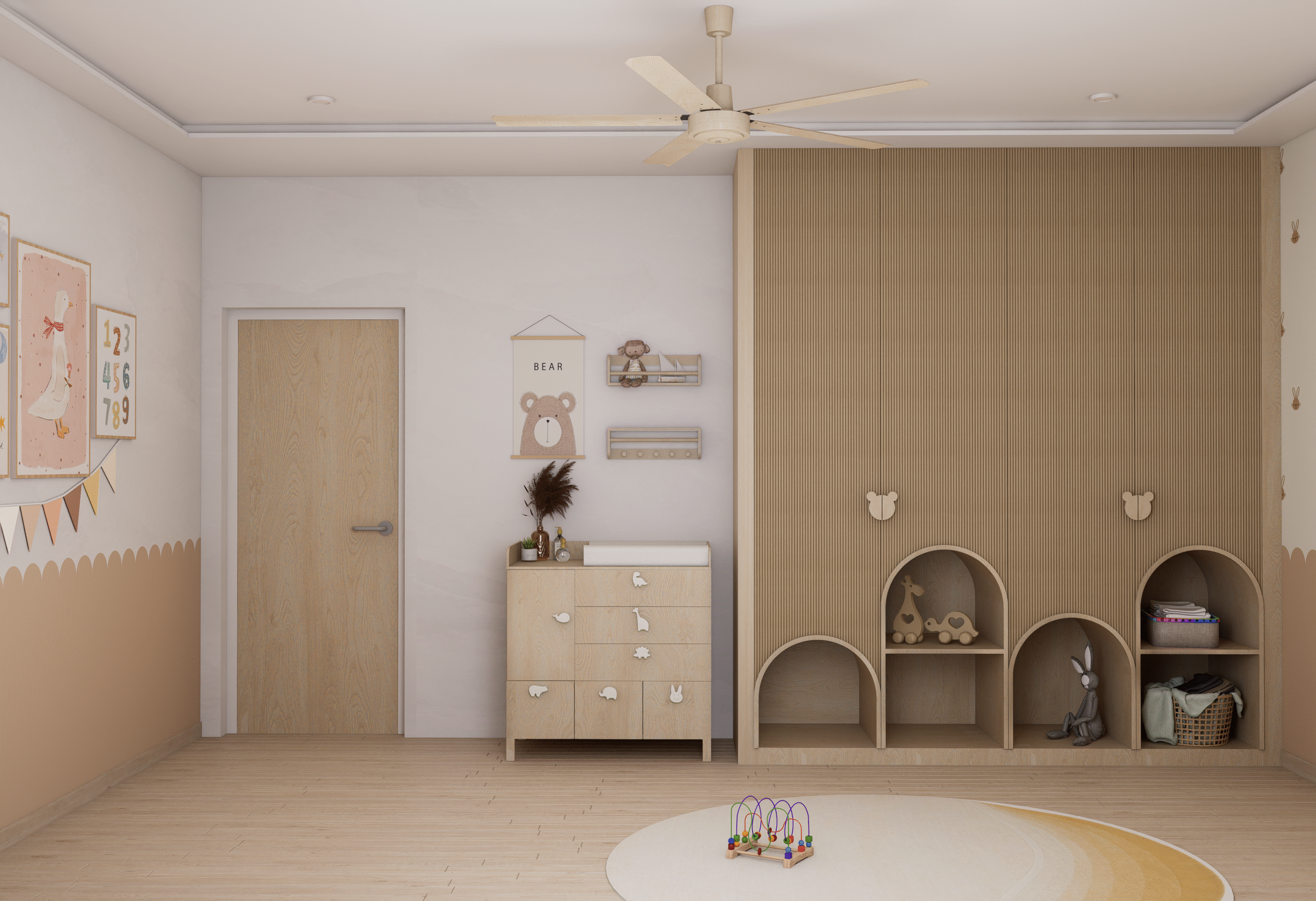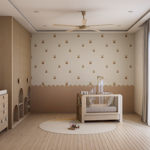 Embodying Nordic simplicity with gentle playfulness, this nursery features scalloped terracotta-beige walls topped with cream curves, subtle bunny motifs, and rounded alcove shelves that evoke rolling hills and safe edges. Natural, sustainable finishes include light ash plank flooring, birch and oak furniture sealed with water-based varnish, low-VOC paint, linen-blend curtains, a wool rug, and beechwood mobiles. Thoughtful storage combines a changing-station dresser, eye-level alcove cubbies, hidden bins under the crib, and a plush rocking nook. Babies benefit from calm neutrals, tactile exploration, and gentle visual cues; mothers enjoy ergonomic seating, efficient workflows, and a clutter-free retreat for confident, peaceful parenting.