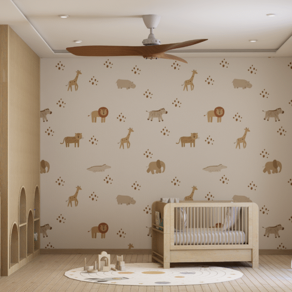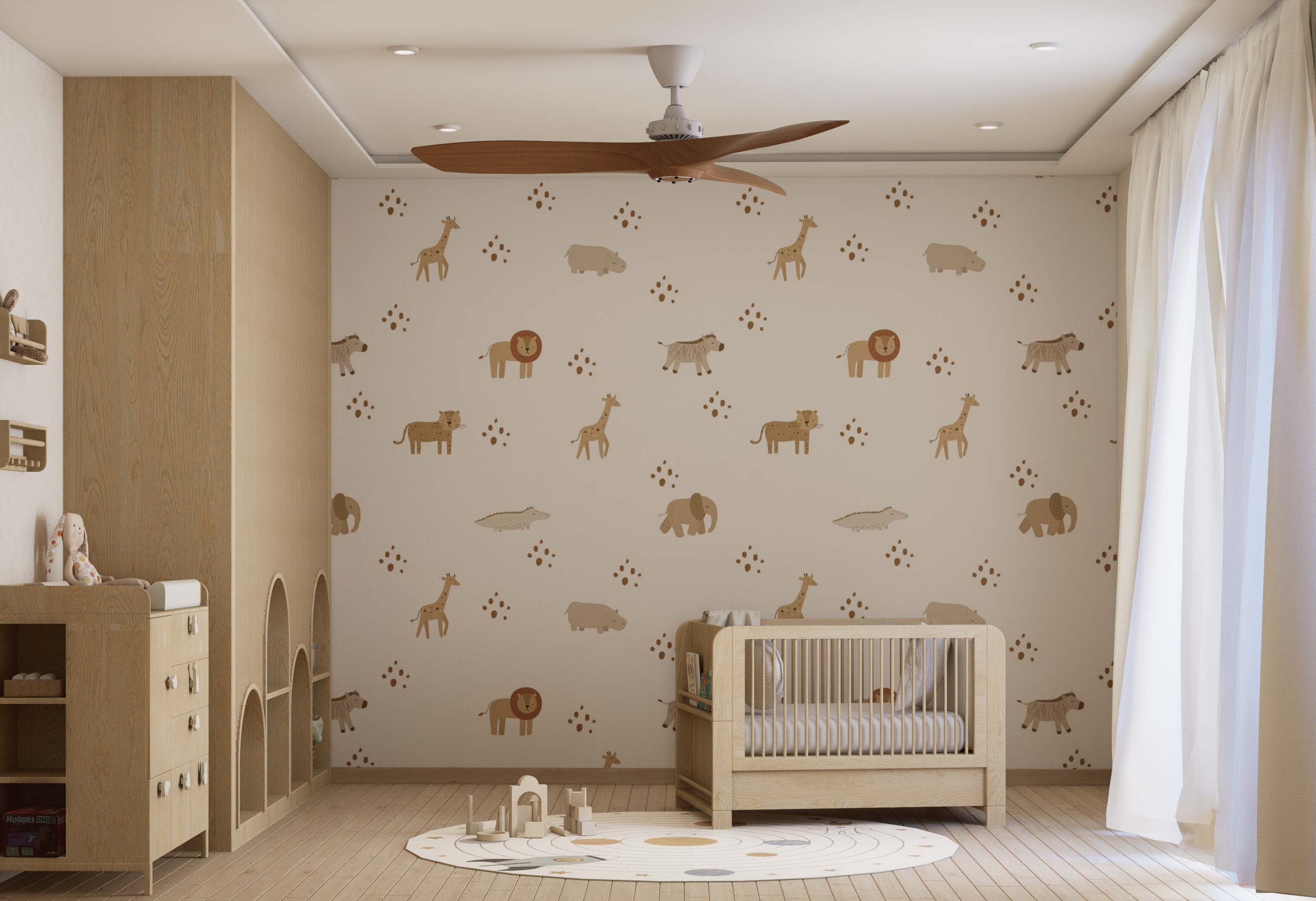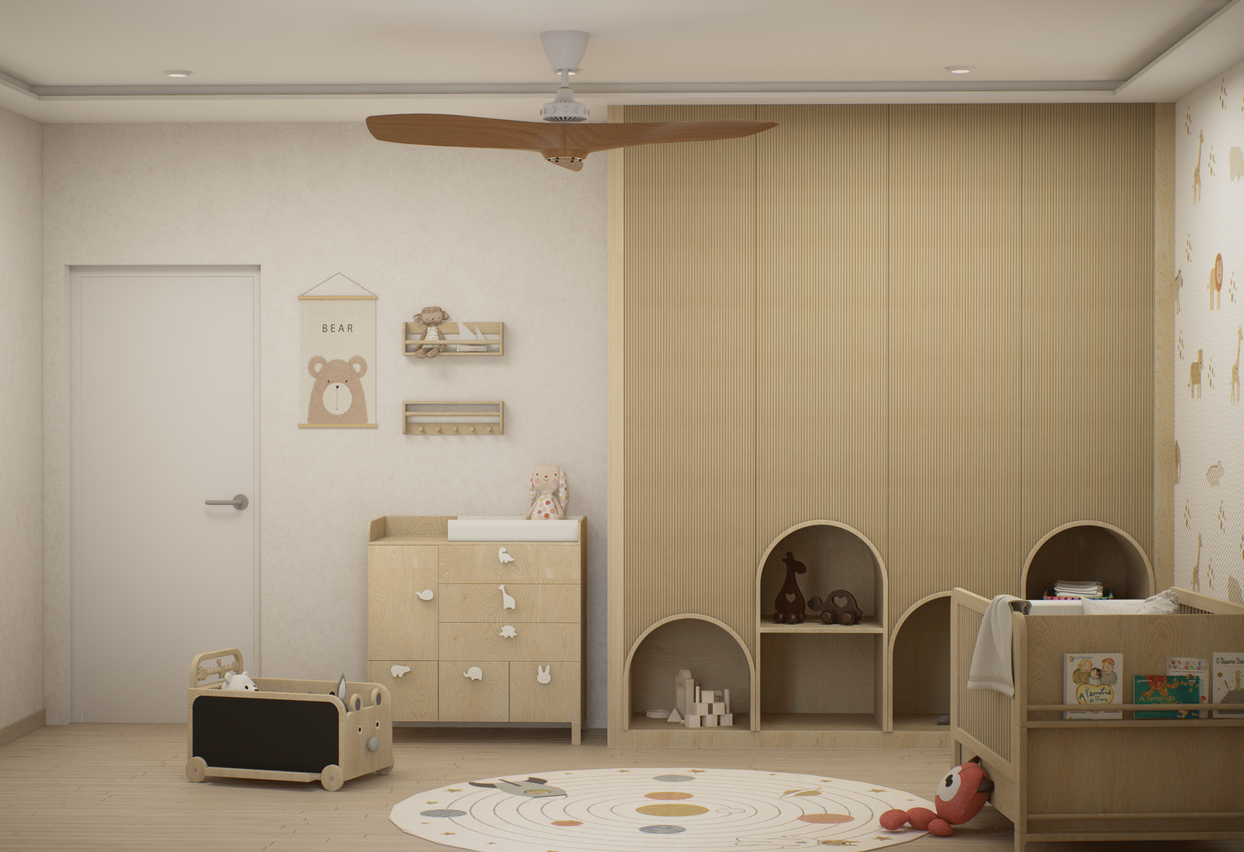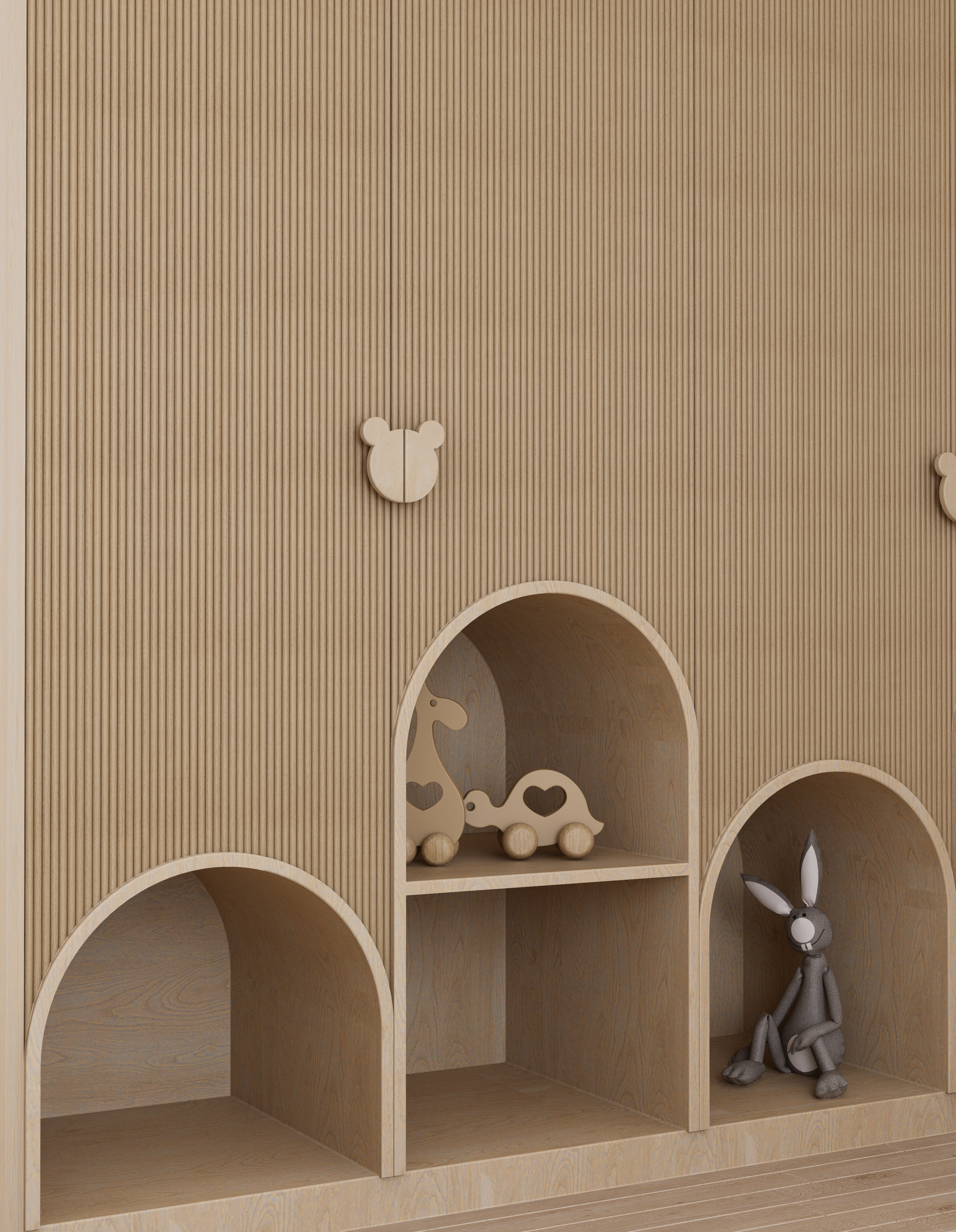 Embodying Nordic simplicity with gentle playfulness, this nursery features scalloped terracotta-beige walls topped with cream curves, subtle bunny motifs, and rounded alcove shelves that evoke rolling hills and safe edges. Natural, sustainable finishes include light ash plank flooring, birch and oak furniture sealed with water-based varnish, low-VOC paint, linen-blend curtains, a wool rug, and beechwood mobiles. Thoughtful storage combines a changing-station dresser, eye-level alcove cubbies, hidden bins under the crib, and a plush rocking nook. Babies benefit from calm neutrals, tactile exploration, and gentle visual cues; mothers enjoy ergonomic seating, efficient workflows, and a clutter-free retreat for confident, peaceful parenting.