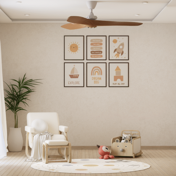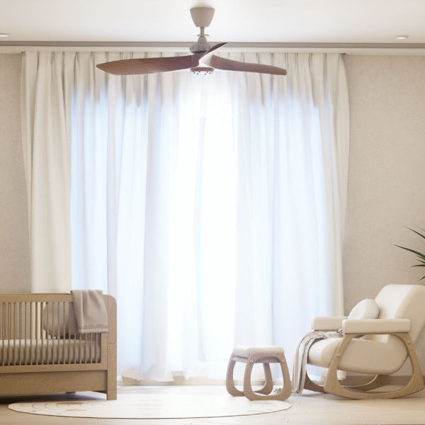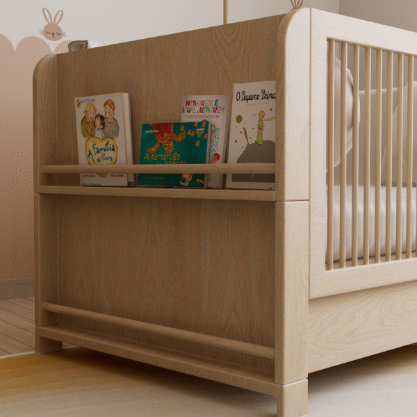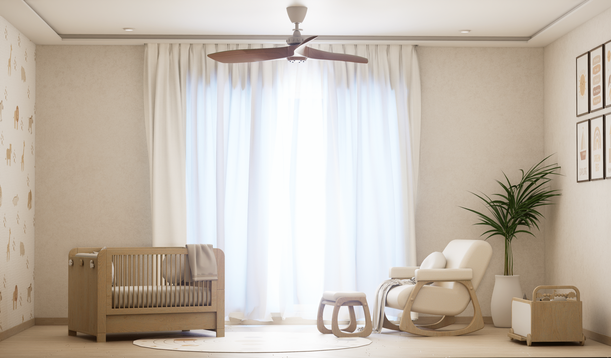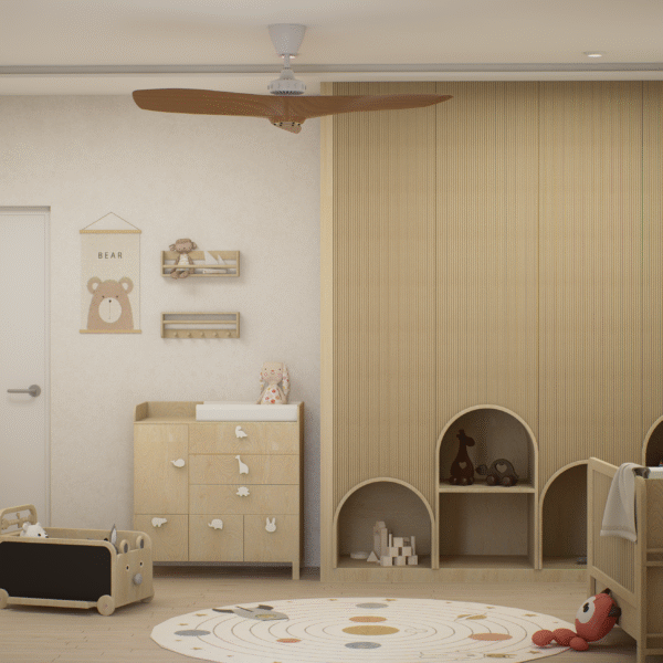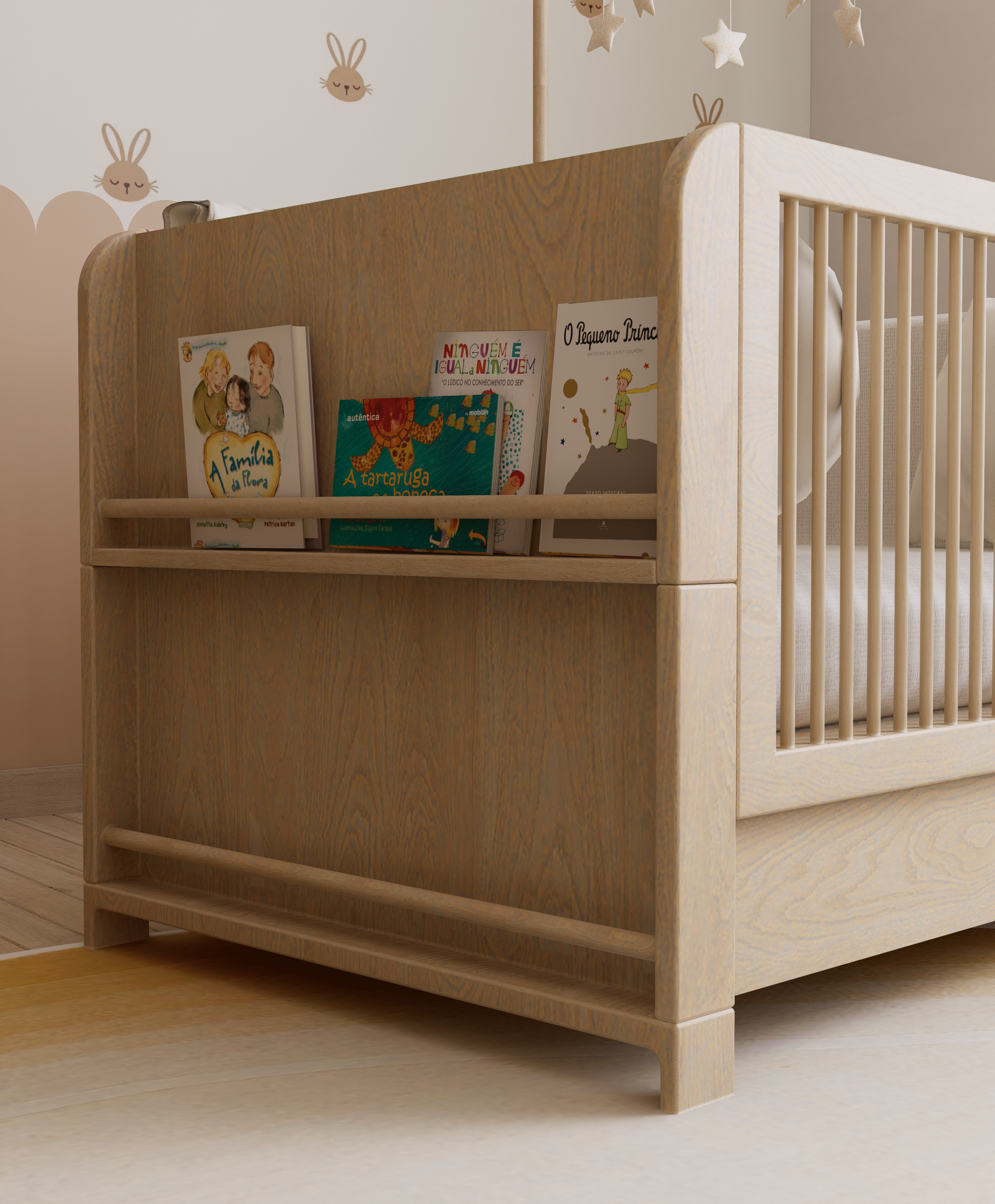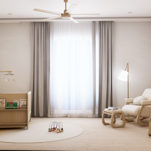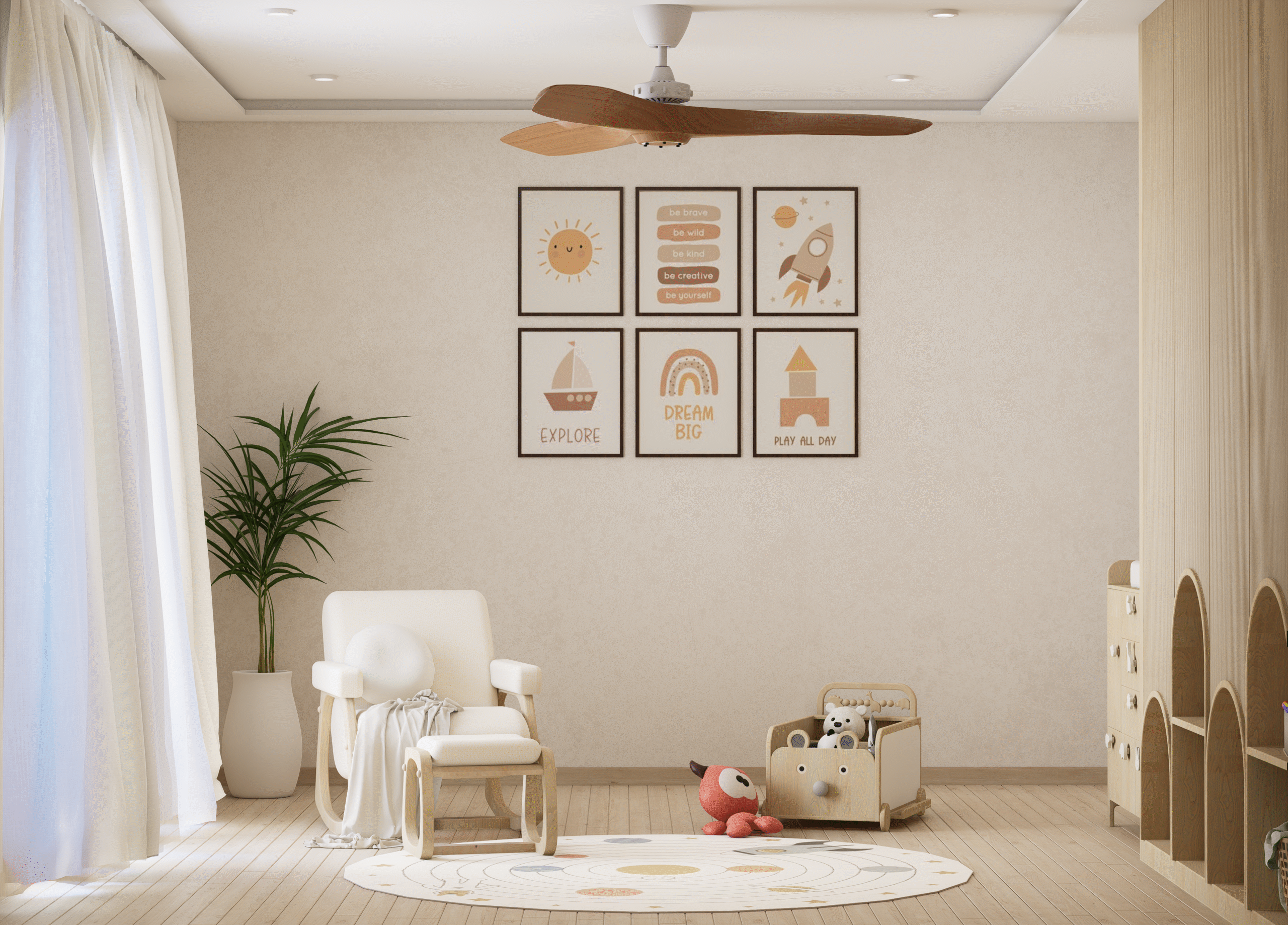 Embodying Nordic simplicity with gentle playfulness, this nursery features scalloped terracotta-beige walls topped with cream curves, subtle bunny motifs, and rounded alcove shelves that evoke rolling hills and safe edges. Natural, sustainable finishes include light ash plank flooring, birch and oak furniture sealed with water-based varnish, low-VOC paint, linen-blend curtains, a wool rug, and beechwood mobiles. Thoughtful storage combines a changing-station dresser, eye-level alcove cubbies, hidden bins under the crib, and a plush rocking nook. Babies benefit from calm neutrals, tactile exploration, and gentle visual cues; mothers enjoy ergonomic seating, efficient workflows, and a clutter-free retreat for confident, peaceful parenting.
